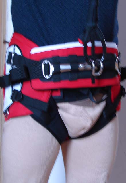 腰垫也叫护腰,人民币480元,有2种模式:一种直接环绕在腰上,Waist Harness;另一种就象三角裤头穿过大腿,坐在上面,Seat Harness。 腰垫与挂钩儿是配套使用的,挂钩儿不锈钢制作,直接串在护腰上。
