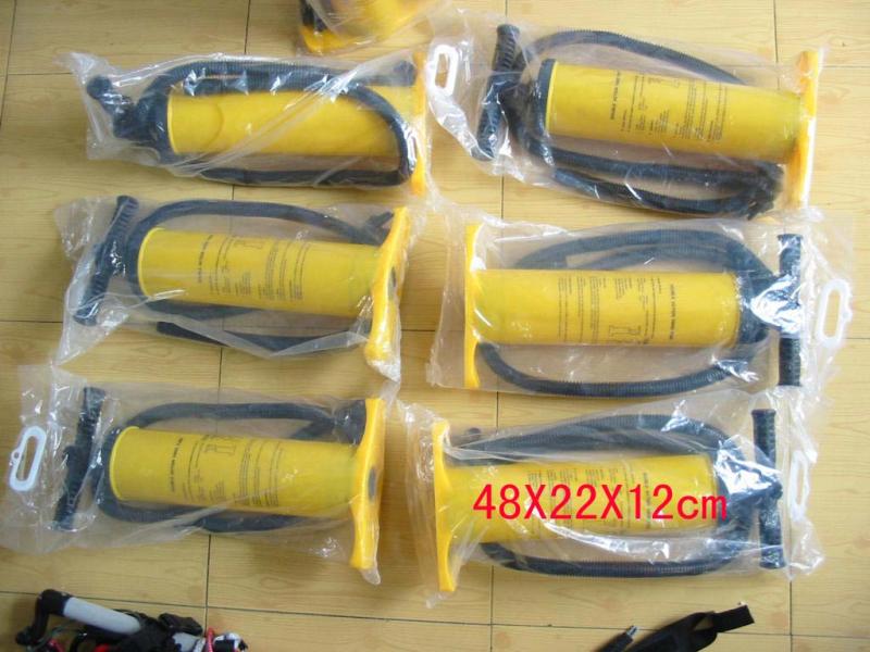 双向打气筒:一个进气孔,一个出气孔,不管拉出还是压下活塞,都能充气或者吸气。铝杆的150元,塑料杆的80元。飘流船,橡皮船都使用双向打气筒充气。气管上带有多个气嘴,适应不同需求。